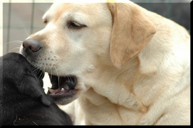 Bij thuiskomst, na een plas op eigen grond (dat plast toch het aller aller lekkerste!), worden de twee wereld reizigers meteen zorgvuldig en uitbundig begroet door hun mams; snuffel snuffel, lik, slobber. Wat fijn dat jullie er weer zijn! Kom maar mee, dichtbij mij. Moeder liefde, moeder zorg.